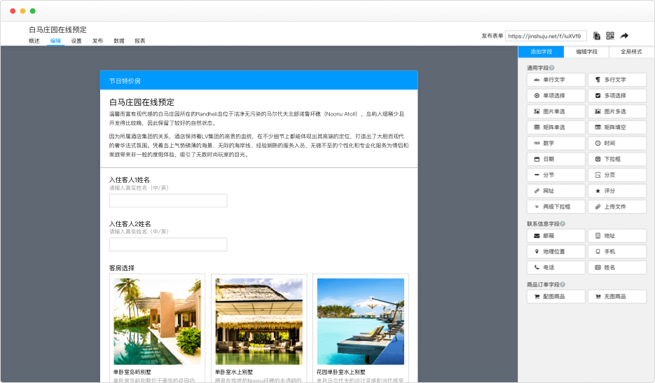 金数据(jinshuju.net)是人人可用的在线表单工具,快速创建问卷调查、活动报名、意见反馈、信息登记、在线订单、考试测评等表单,自动化收集整理数据,节省工作时间,更聪明、更体面的完成工作。